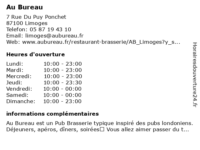 9 visitors have checked in at au bureau. 05 87 19 43 10. Pictures reviews the menu and online booking in one clickau bureau exotic haute vienne limoges 87000.